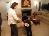 Mr. M called Riley down to discuss her phone bill. She has gone over her text limit for the month, and therefore will be punished for it. He begins to spank her with a wooden spoon, partway into the punishment the spoon breaks, and he then returns with a paddle to finish the punishment.