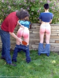 Danny catches Brooke and Betty sneaking a cigarette in the bushes. Brooke is bent over with her hands on the tree to receive a fast belting on her bare bottom while Betty watches. He then makes the girls switch positions and spanks Betty the same way. Afterward, he marches the girls back into school.